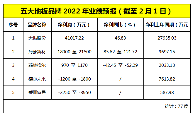 五大地板品牌2022年业绩预告:天振4.1亿净利暂居头筹